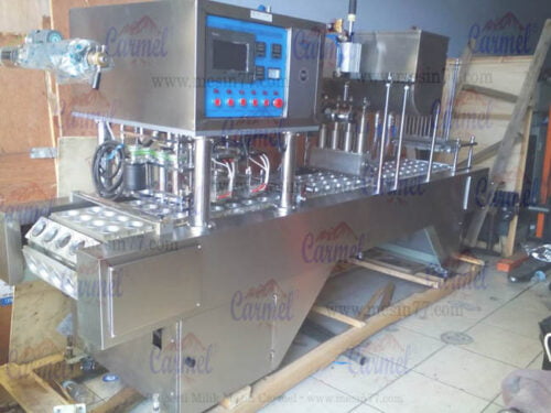 Selamat pagi sahabat Carmel, yuk mari mengenal lebih jauh lagi bermacam-macam mesin pengisian dan pengemasan. Beberapa waktu yang lalu kita membahas mengenai mesin cup sealer 2 line atau mesin mengisi dan menutup gelas cup dengan 2 produk sekali keluar. Nah sekarang kita mengenal mesin yang lebih lagi diatasnya 2line yaitu 4 line. Wahh pasti lebih besar yah mesinnya? Tentu. Dari nama dan penyebutannya saja pasti kita ketahui bahwa mesin ini mengeluarkan 4 produk sekali keluar. Mesin ini bisa digunakan untuk pengisian AMDK ataupun minuman rasa. Tidak perlu kawatir karena body mesin ini sudah memakai stainless steel standart grade makanan.